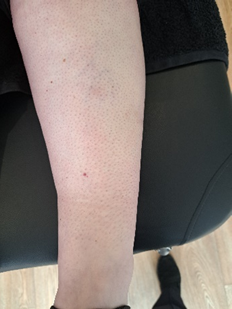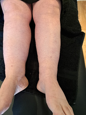 After 4 sessions of treatment. Leg appears normal with good circulation and no pain on walking after 8 years.